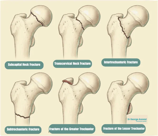 - Location of the fracture (e.g. femoral neck, intertrochanteric)
